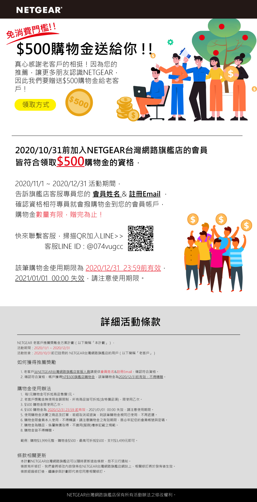 活動對象:2020/10/31前已註冊的 NETGEAR台灣網路旗艦店的用戶(以下簡稱「老客戶」)