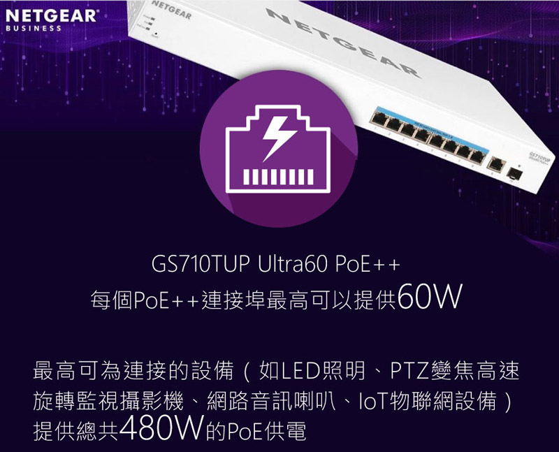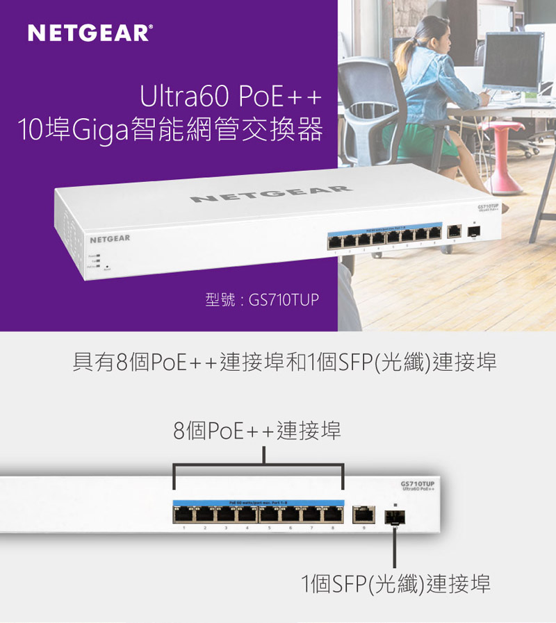★提供8個PoE/PoE+ 連接埠,8個支援UPoE(PoE++)供電