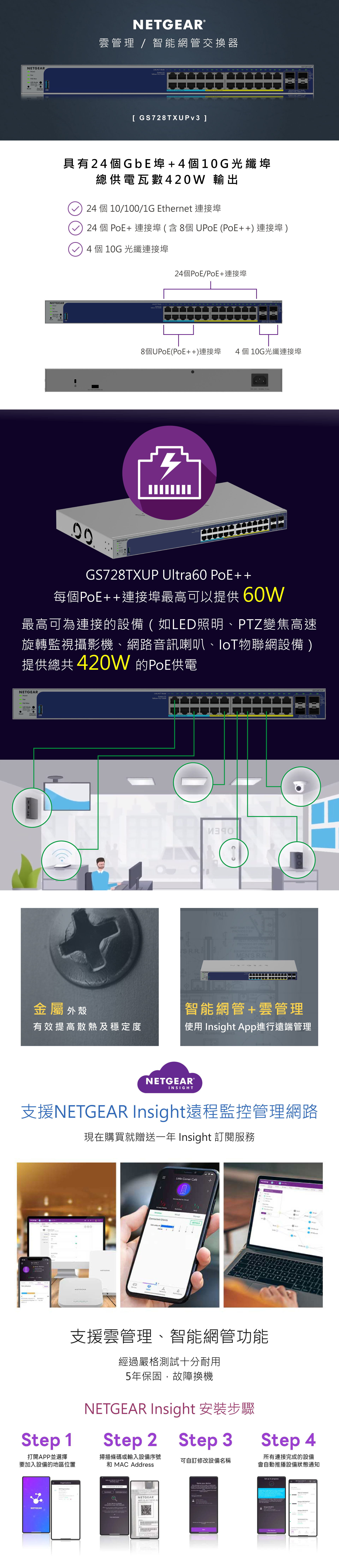 ★GS728TXUP總供瓦數420W,支援 IP 監控、AP 等多種裝置。