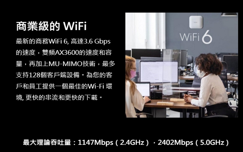 ★高性能商用802.11ax Wave 2雙頻WiFi,吞吐量3.6Gbps