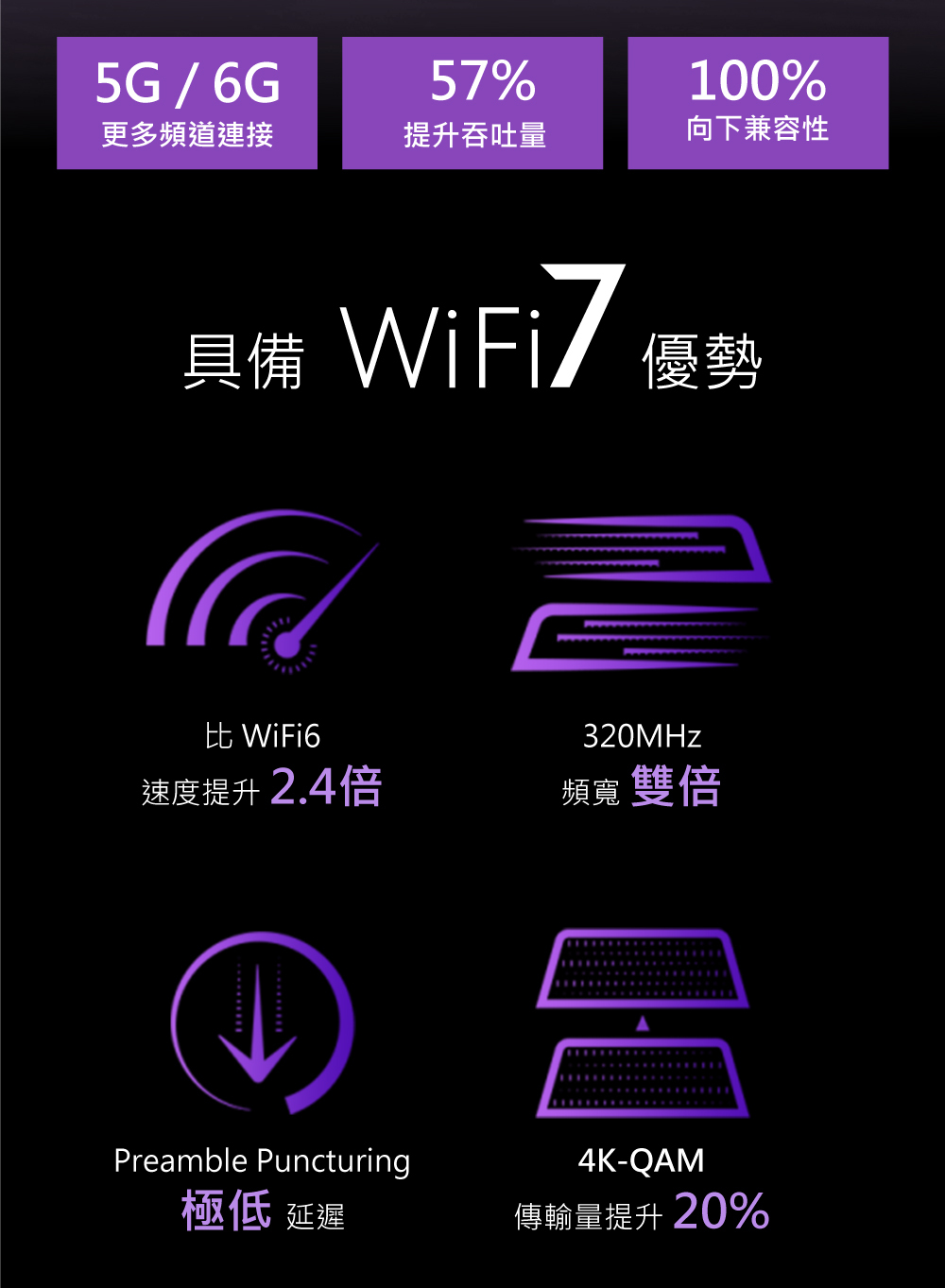 ★提供高性能商務級 802.11be 三頻 Wifi,總吞吐量高達9.4Gbps